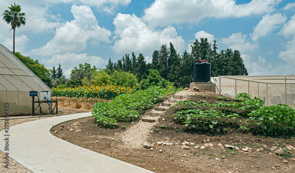 an experimental research area on kibbutz magal in israel showing drip irrigation, shaded greenhouses and outdoor crops with a forest in the background