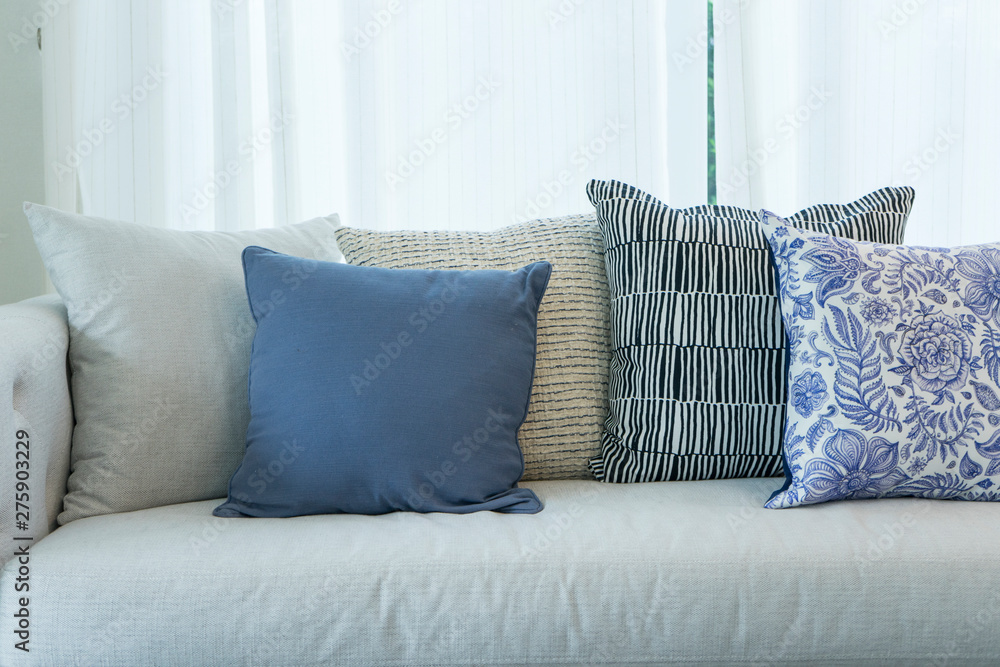 close up of set of white, blue and grey pillows on white Sofa