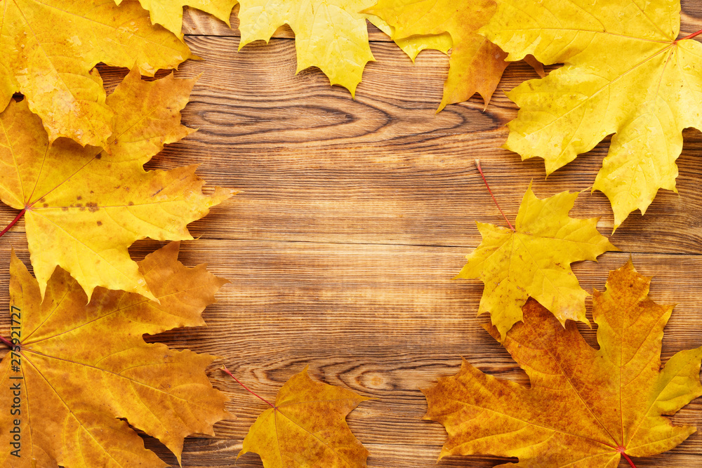 Yellow maple leaves frame background. Autumn seasonal concept.