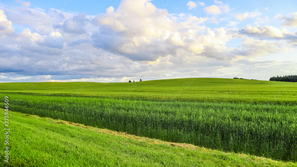 Wonderful green field, hills, trees and blue sky with clouds in the countryside. Spring landscape