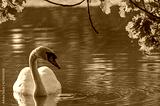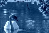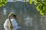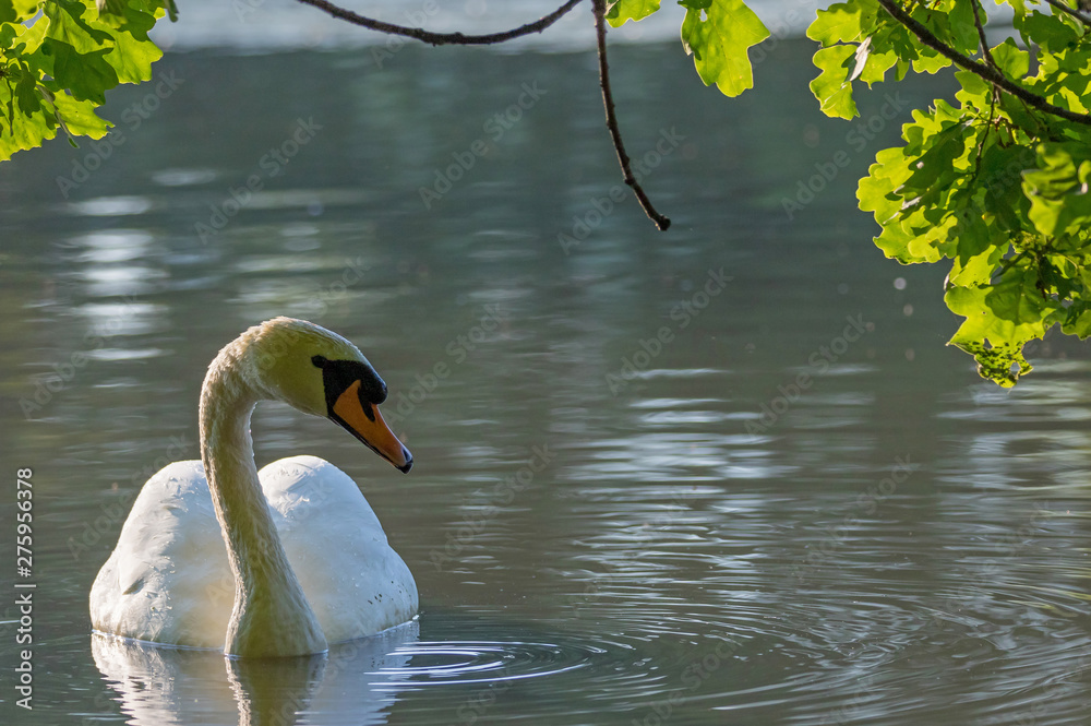 Front view of the beautiful white swan under trees on the lake. Waterfowl. White bird.