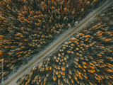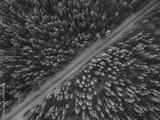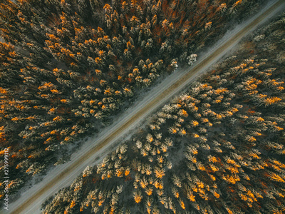 Aerial drone view of road in idyllic winter landscape. Street running through the nature from a birds eye view.