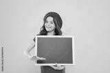 big sales. child on yellow backdrop. back to school. Interesting info. happy girl in french beret. small girl kid with school backboard, copy space. information board. Fashion news. place for writing