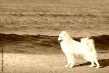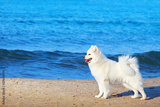 White fluffy Samoyed dog walks along the beach on the background of the stormy sea.