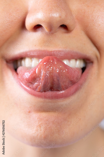 A closeup view on the mouth of a beautiful young Caucasian girl. She sticks her tongue out and curls it up towards her nose.