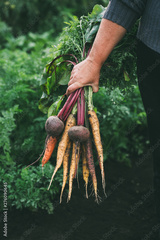 Bunch of vegetables in women's hand. Organic carrots and beets. Healthy food.