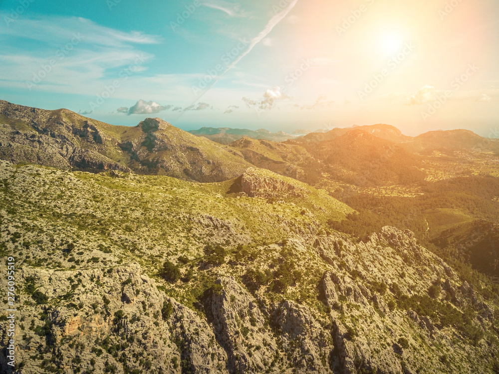 Beautiful birdeye view on forest in mountains at sunny day. Palm