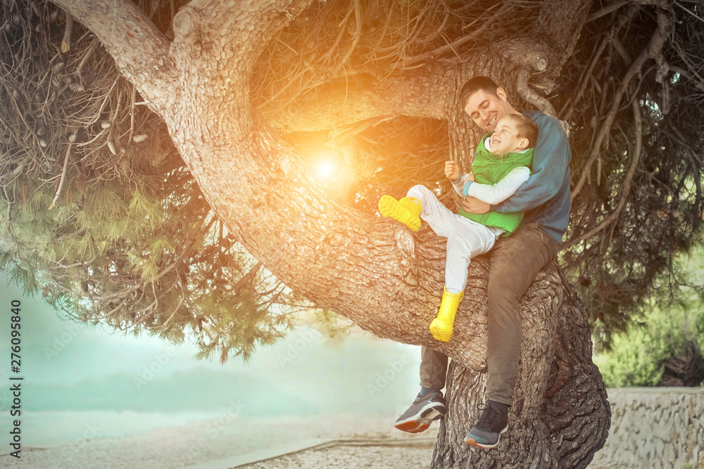 Happy childhood, father and son sit on a tree on a sunny day, fa