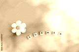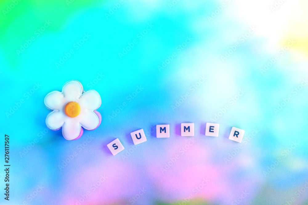The word summer with ginger biscuit flower on a gradient double exposure watercolor background. Flat lay with copy space