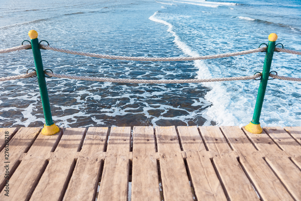View at the waves in the sea from the wooden pier with posts and ropes with sparkling sea water. Side view with copy space for travel destination and sea or ocean marine cruise vacation