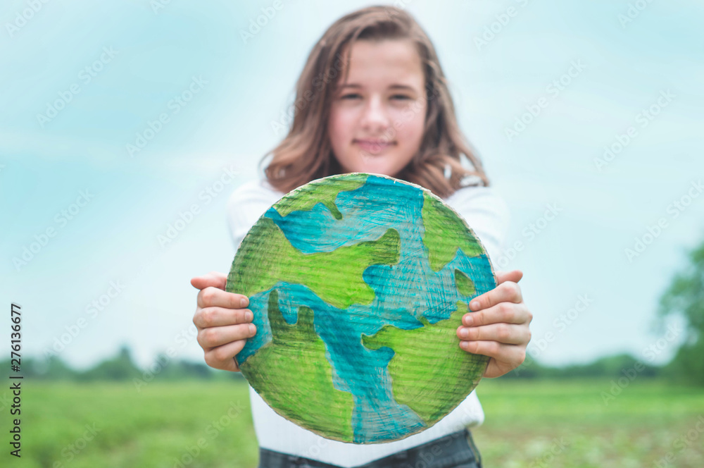 Teen girl holding planet in hands against green spring background. Earth day holiday concept. Protection and love of earth