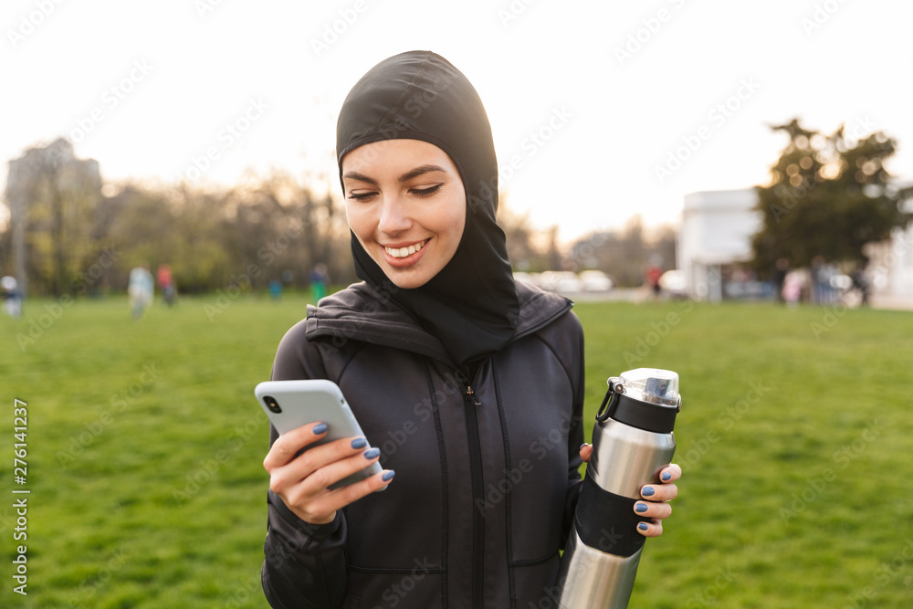 Young cheerful muslim sports fitness woman dressed in hijab and dark clothes outdoors in green nature park holding bottle with water using mobile phone chatting.