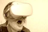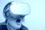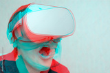 Young man of virtual reality. Innovation and technological advances. Modern technology for business. anaglyph effect, glitch, Double Color Exposure Effect .