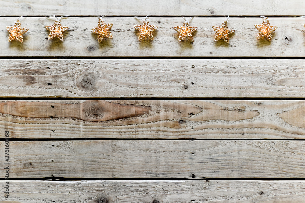 Christmas lights, star shaped fairy lights on a string over wooden boards with copy space