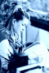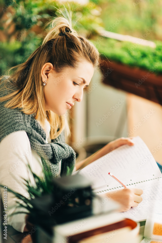 Young woman stuyding at home, sitting on the balcony, making notes in a nitebook, view through the window