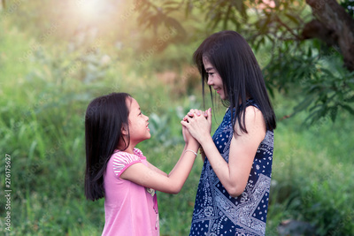Mother and daughter looking eyes and holding hands with love