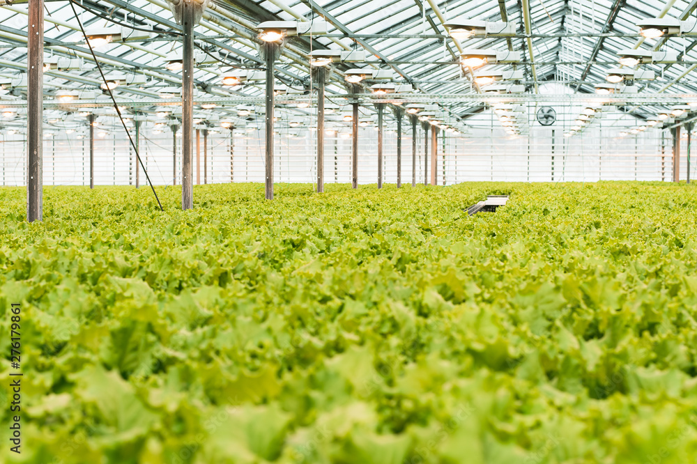 Industrial production of lettuce and greens. Closed light large greenhouse