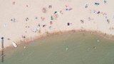 Aerial top view of people sunbathing swimming and relaxing in lake