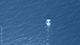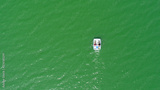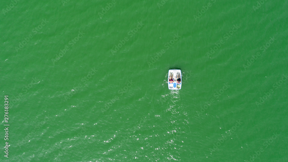 Aerial view of couple on paddle boat having fun on beautiful lake with green water at summer vacation