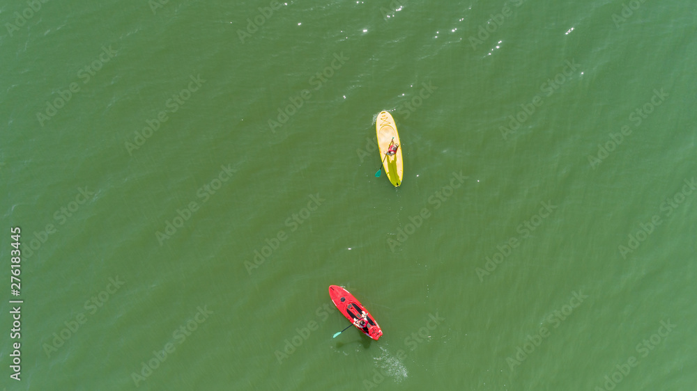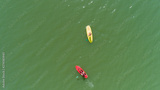 Aerial top down view photo of couple with sup paddle boards on the lake.