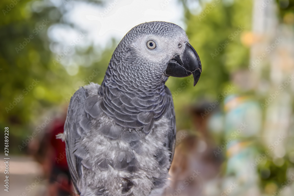 African Grey Parrot with head turned sideways - close-up with focus on head and eye - selective focus with bokeh background - room for copy