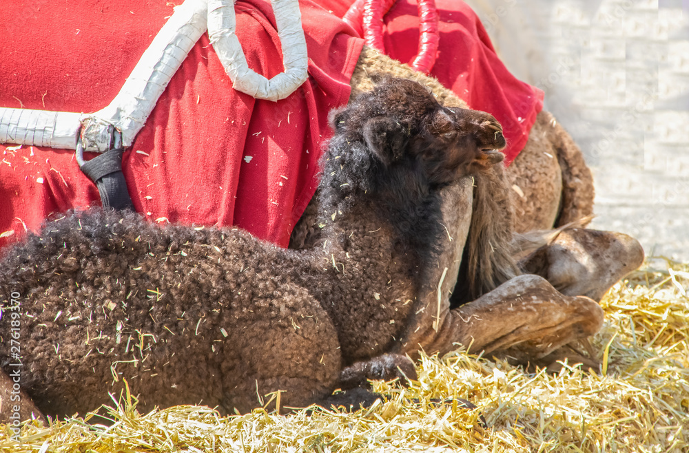 Baby camel - just a few days old - snuggled up against its mother wearing a red blanket in a bed of straw out in the sunshine