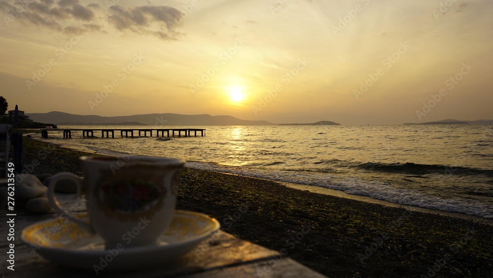 A cup of hot Turkish coffee towards sunset and blue sea water on beach. Relaxation mood, resting vacation, freedom concept photo. Leisure in beautiful sunny summer morning.