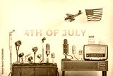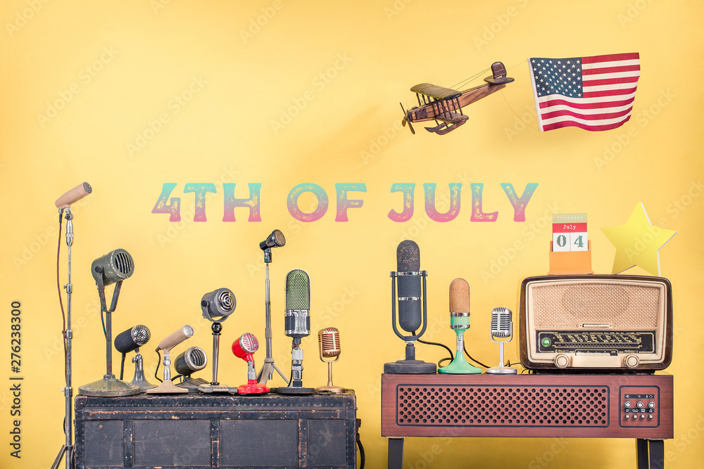 Retro microphones, wooden plane and USA flag, old radio, calendar, star front yellow background with 4th of July date text. Independence day congratulations greeting card. Vintage style filtered photo