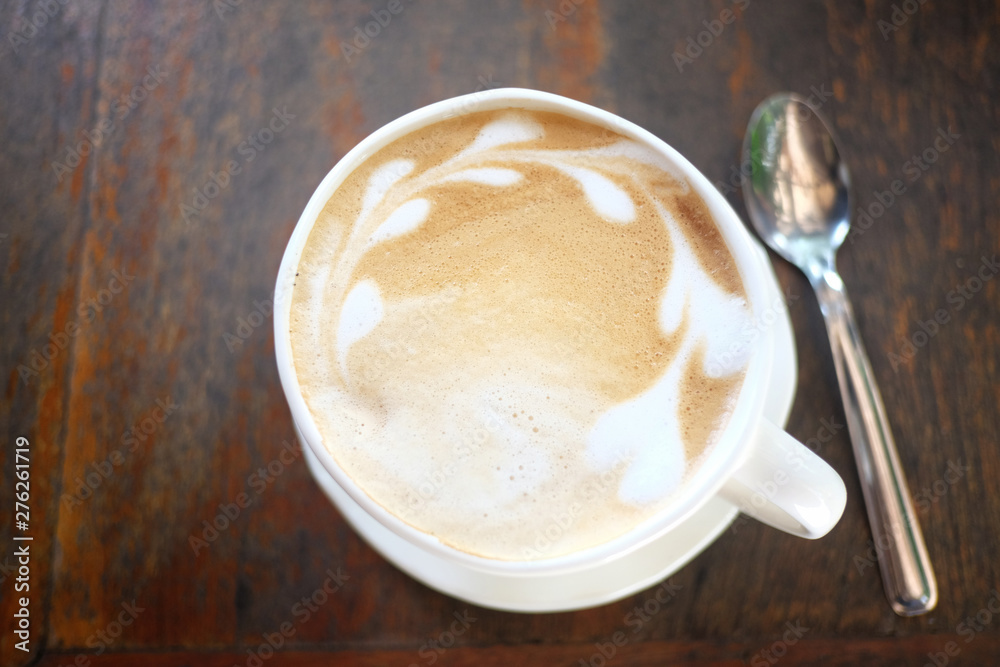 Latte coffee in the white cup on wooden foods table.