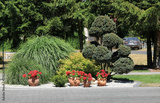 Ozdobne krzewy i czerwone kwiaty w pięknych dzbanach.