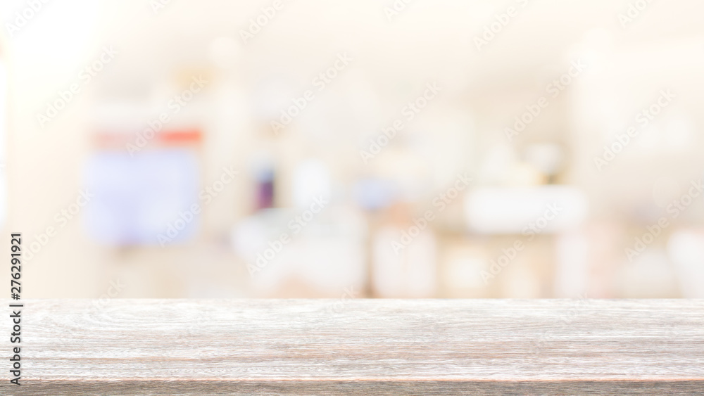 Empty wood table top on blur bokeh cafe and restaurent interior background - can be used for display or montage your products