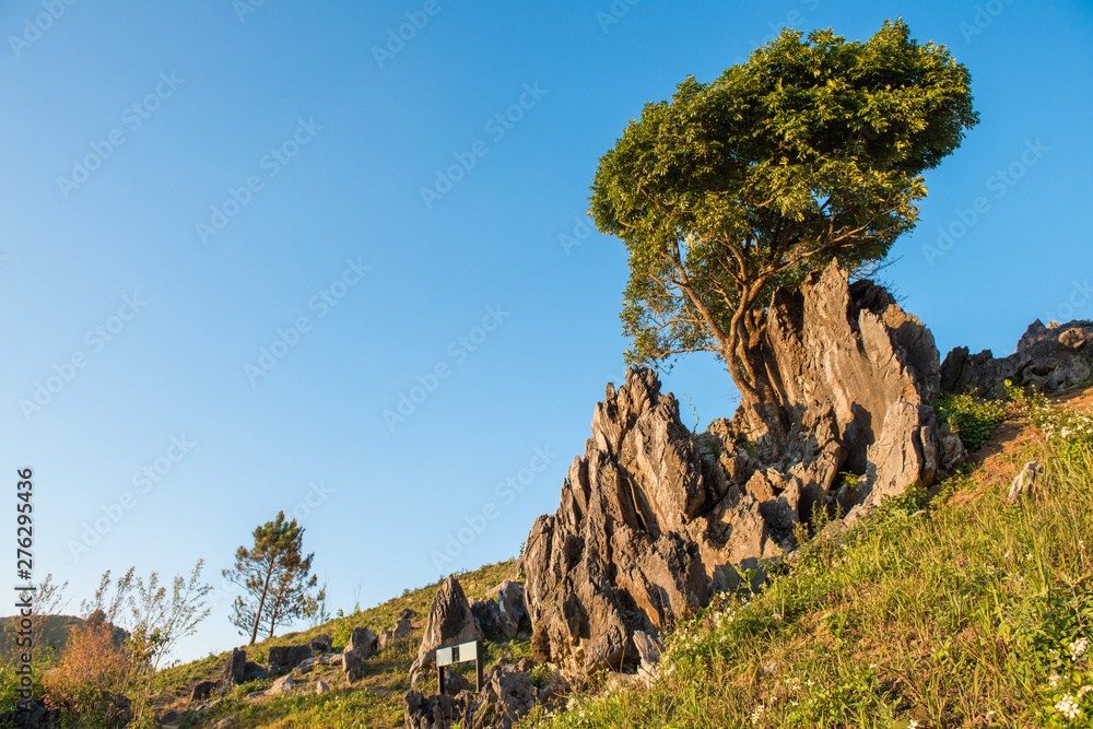 Beautiful stone forest of odd shaped stones and rocks on Doi Pha Tang a high mountain cliff over Thai-Laotian border an area is one of the most stunning place in Chiang Rai province, Thailand.