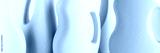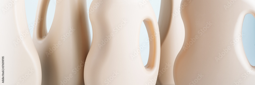 Сlose-up of shape bottles of cleaning products on blue white background overview with space for text. Front view. Cleaning tools, cleanliness and cleaning layout. Long wide banner