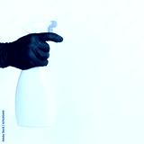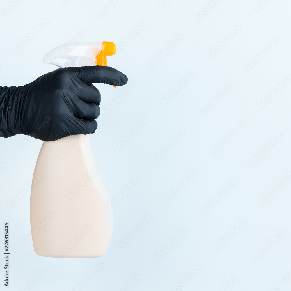 Hand in a black rubber glove holds cleaning products bottle with detergent on light blue background with copy space. Concept of cleaning.