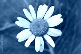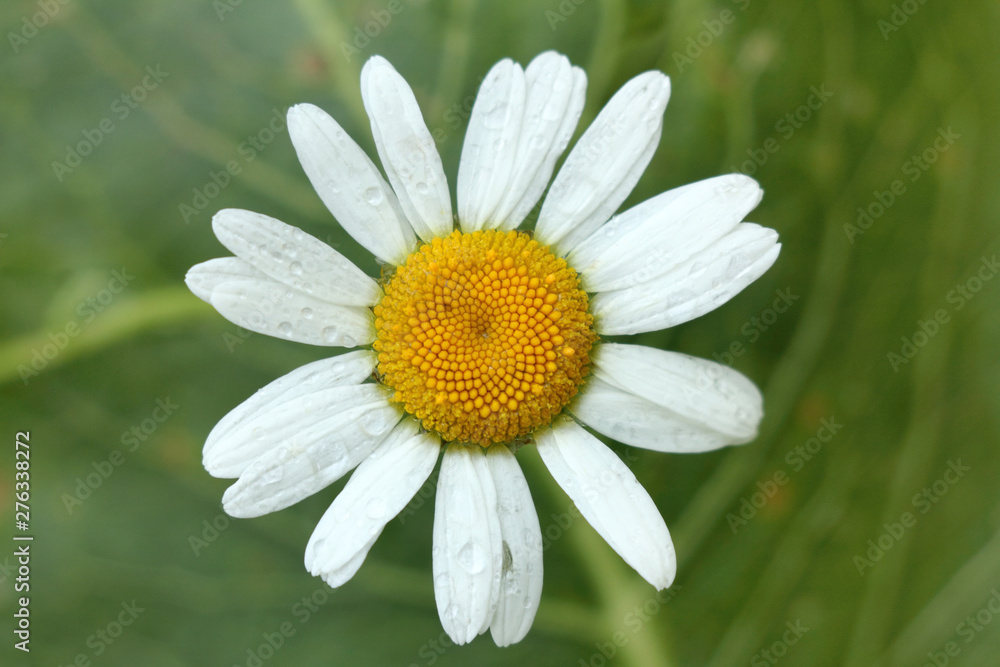 Chamomile with wet petals on a background of green leaves. Top view. wet flower after the rain