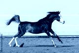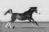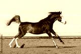 Beautiful black arabian horse running in paddock on the sand background