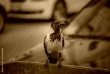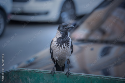 crow eating garbage from a trash bin and doing mess, portrait of crow perching on the trash can in the city