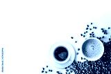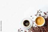 hot espresso and coffee bean on white table with soft-focus and over light in the background. top view