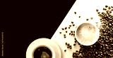 hot espresso and coffee bean on white table with soft-focus and over light in the background. top view
