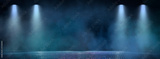 Wet asphalt, reflection of neon lights, a searchlight, smoke. Abstract light in a dark empty street with smoke, smog. Dark background scene of empty street, night view, night city.