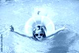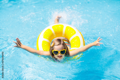 Child in swimming pool on ring toy. Kids swim.