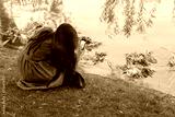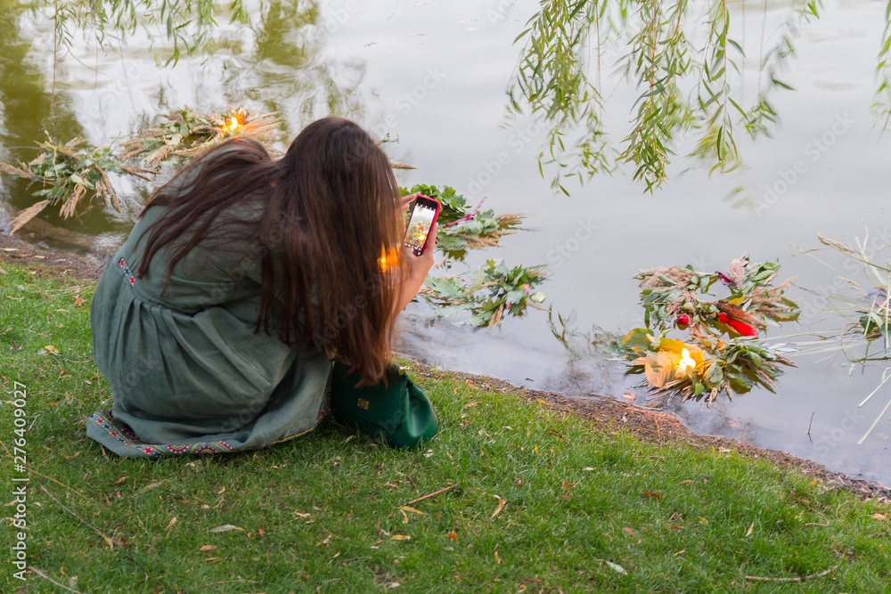 Girl takes pictures of a wreath of flowers in the lake, performing the traditional rite of the Slavic holiday of Ivan Kupala