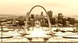 St Louis, Missouri \ USA - January 16 2019: Aerial view of a downtown covered in snow behind Gateway Arch. Old courthouse, The Basilica Of Saint Louis, and a Busch stadium on a winter day