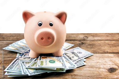 pink piggy bank on dollars on wooden background
