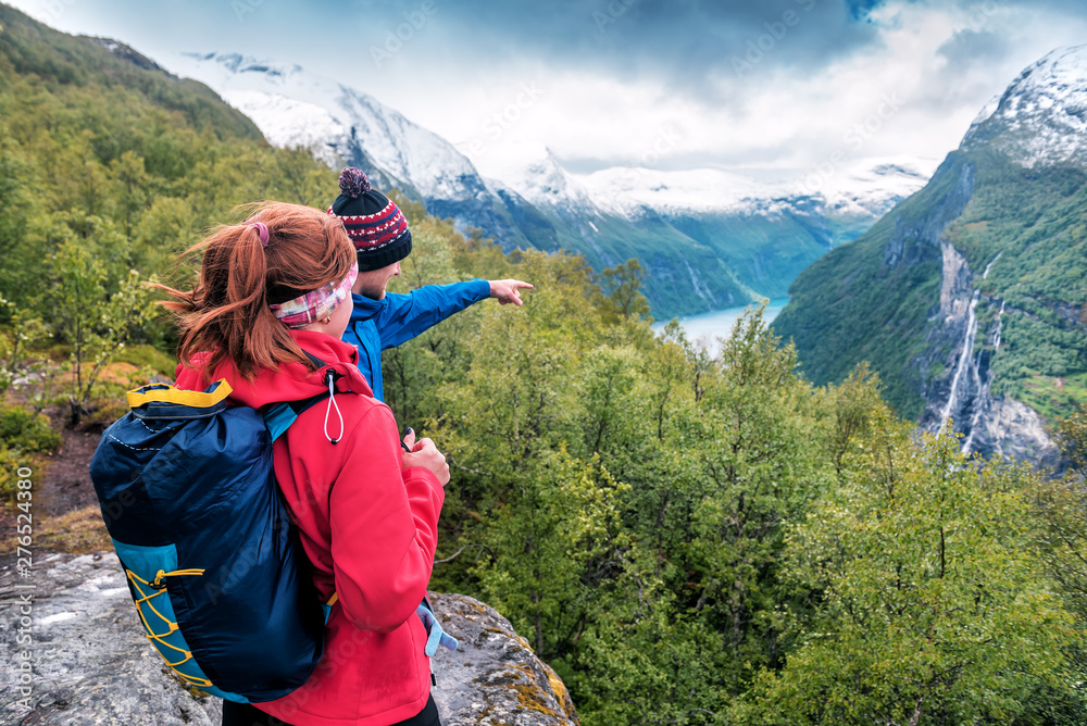 tourist guide shows a girl waterfall in the mountains of Norway