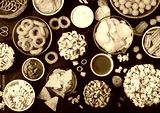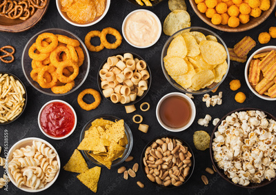 All classic potato snacks with peanuts, popcorn and onion rings and salted pretzels in bowl plates on black background. Twirls with sticks and potato chips and crisps with nachos and cheese balls.