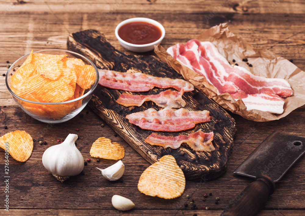 Potato crisps with backon flavour with grilled bacon rashers on vintage chopping board with garlic and sauce on wooden background with meat hatchet.