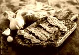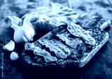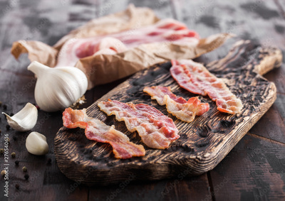 Grilled bacon strips on vintage wooden board with raw fresh smoked pork bacon on butchers paper on wooden board with garlic.