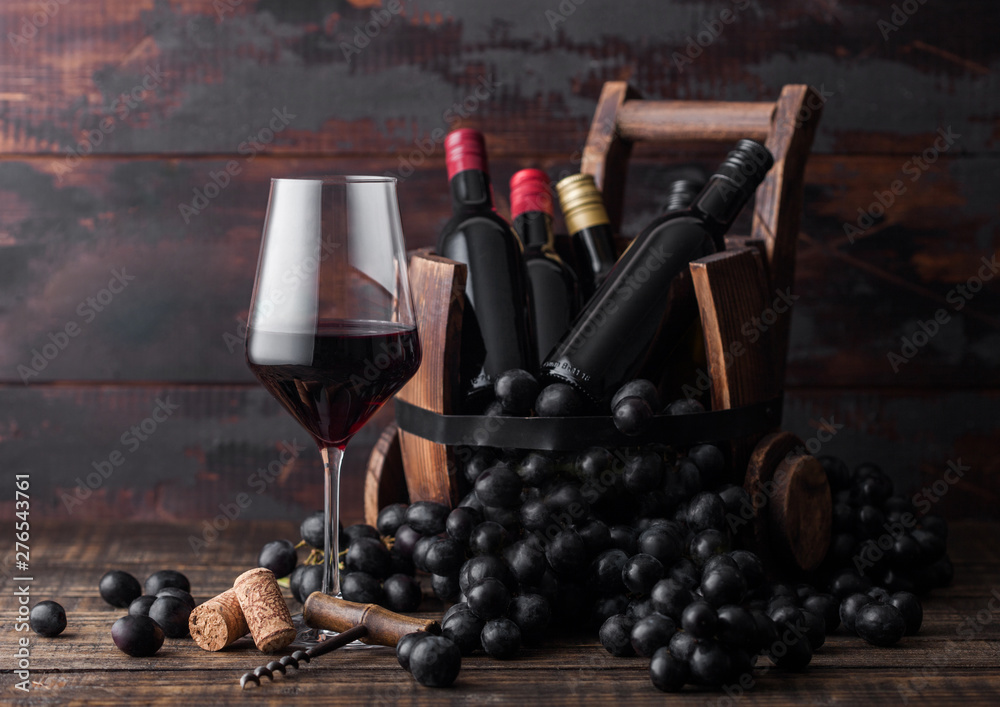 Elegant glass of red wine with dark grapes and mini bottles of wine inside vintage wooden barrel on dark wooden background. Natural Light