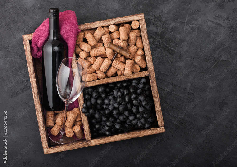 Luxury bottle of red wine and empty glass with dark grapes with corks and corkscrew inside vintage wooden box on black stone background with red cloth. Top view